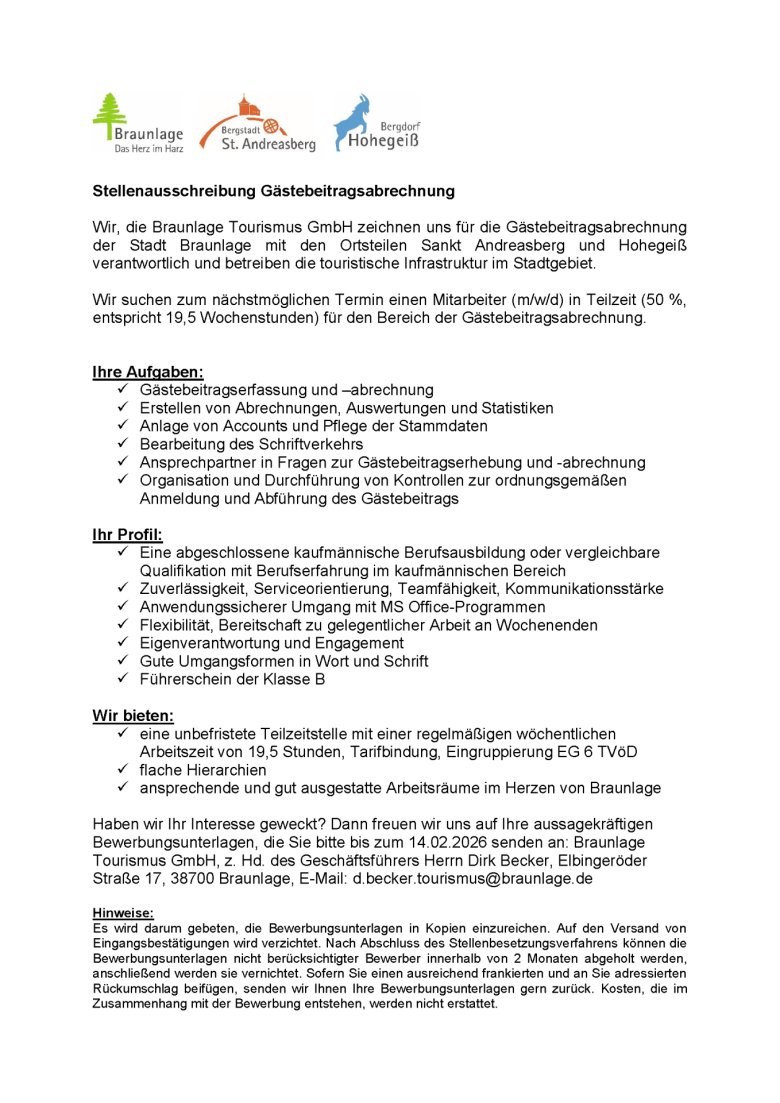 Stellenangebot Gästebeitragsabrechnung BTG