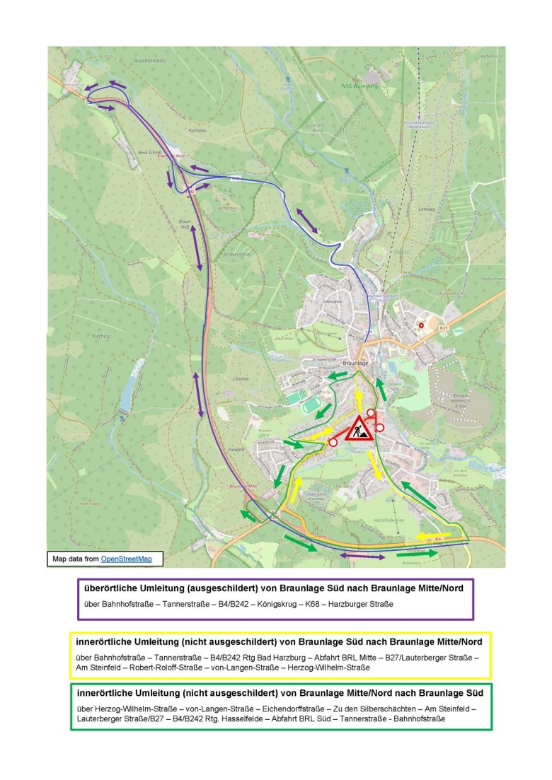 Für die Sanierungsmaßnahme der B27 im Bereich der Ortsdurchfahrt Braunlage gibt es eine überörtliche Umleitung sowie Möglichkeiten für Anlieger, ihre Grundstücke zu erreichen. Bitte beachten Sie unbedingt die Beschilderung an der Baustelle.