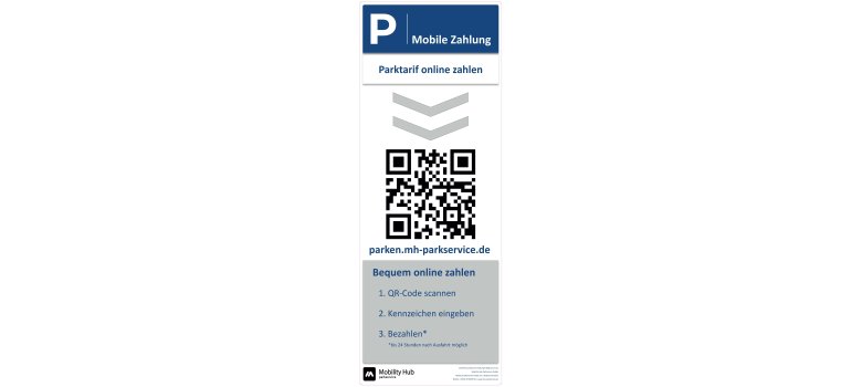 QR-Code scannen oder über https://parken.mh-parkservice.de/ bis 24 h nach Ausfahrt ohne Aufschlag online zahlen.