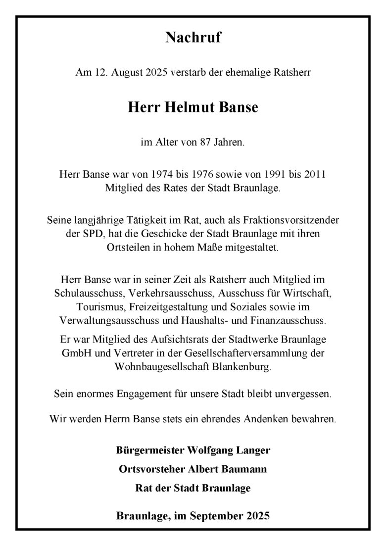 Herr Banse war von 1974 bis 1976 sowie von 1991 bis 2011 Mitglied des Rates der Stadt Braunlage.