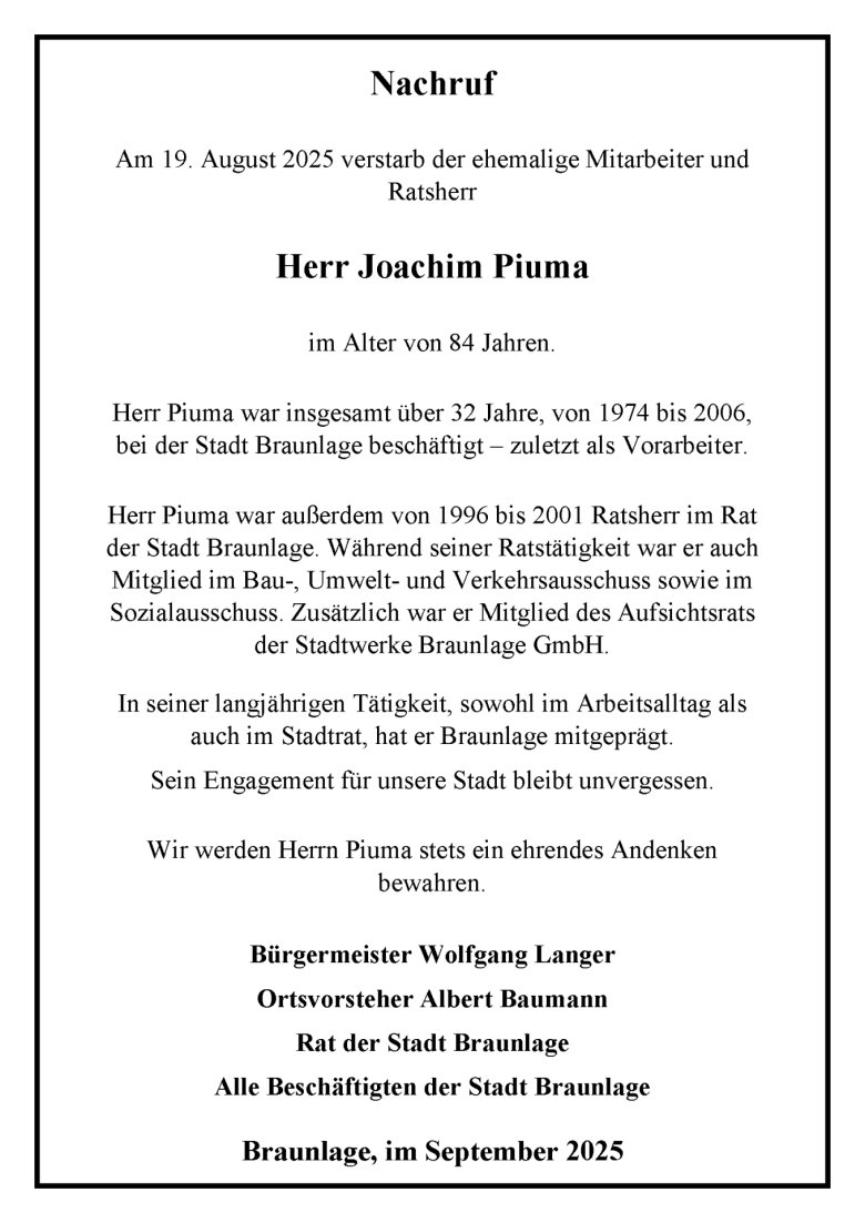 Herr Piuma war insgesamt über 32 Jahre, von 1974 bis 2006, bei der Stadt Braunlage beschäftigt – zuletzt als Vorarbeiter.